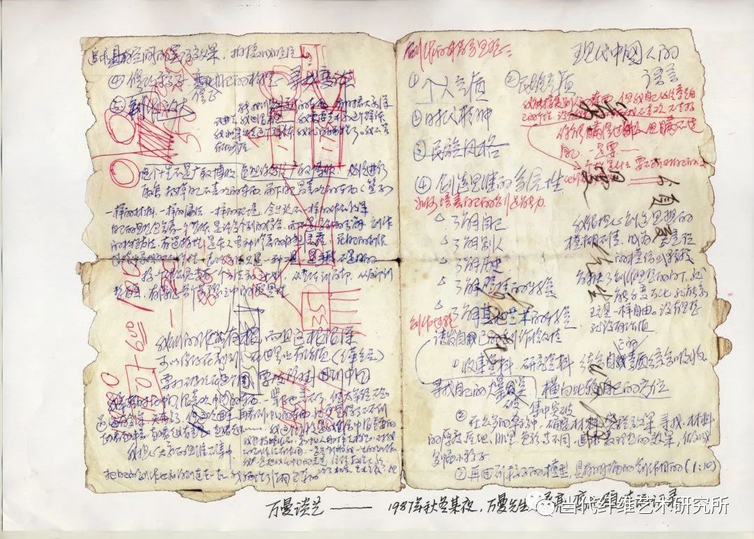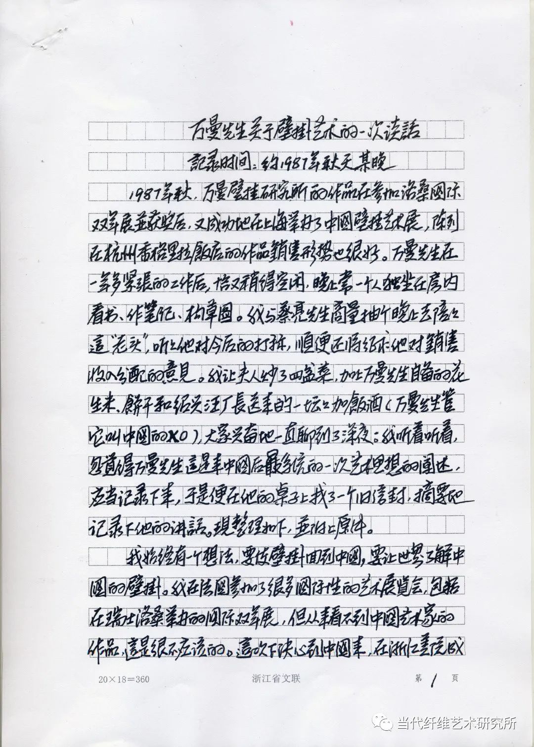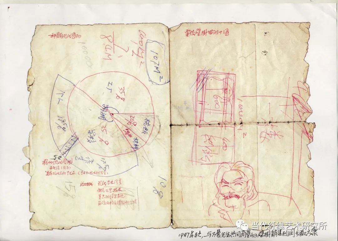 1987年秋,万曼壁挂研究所的作品在参加洛桑国际双年展获奖后,又成功地在上海举办了中国壁挂艺术展,陈列在杭州香格里拉,反映的作品销售形势也很好。万曼先生在一年多紧张的工作后,恰又稍得空闲,晚上常一个独坐在房内看书、做笔记、构草图。我与蔡亮先生商量抽个晚上去陪这个“老头”,听他对今后的打算,顺便还特地求他对销售收入分配的意见。我让夫人炒了四盆菜,加上万曼先生自备的花生来,饼干和绍兴汪厂长送来的一坛的加饭酒(万曼先生管它叫中国的XO),大家兴奋地一直聊到了深夜。我听着听着,忽道得万曼先生这是来中国后最系统的一次艺术思想的阐述,应当记录下来,于是便在他的桌子上找了一个旧信封,摘要地记录下他的讲话。现整理如下,并附上原件。