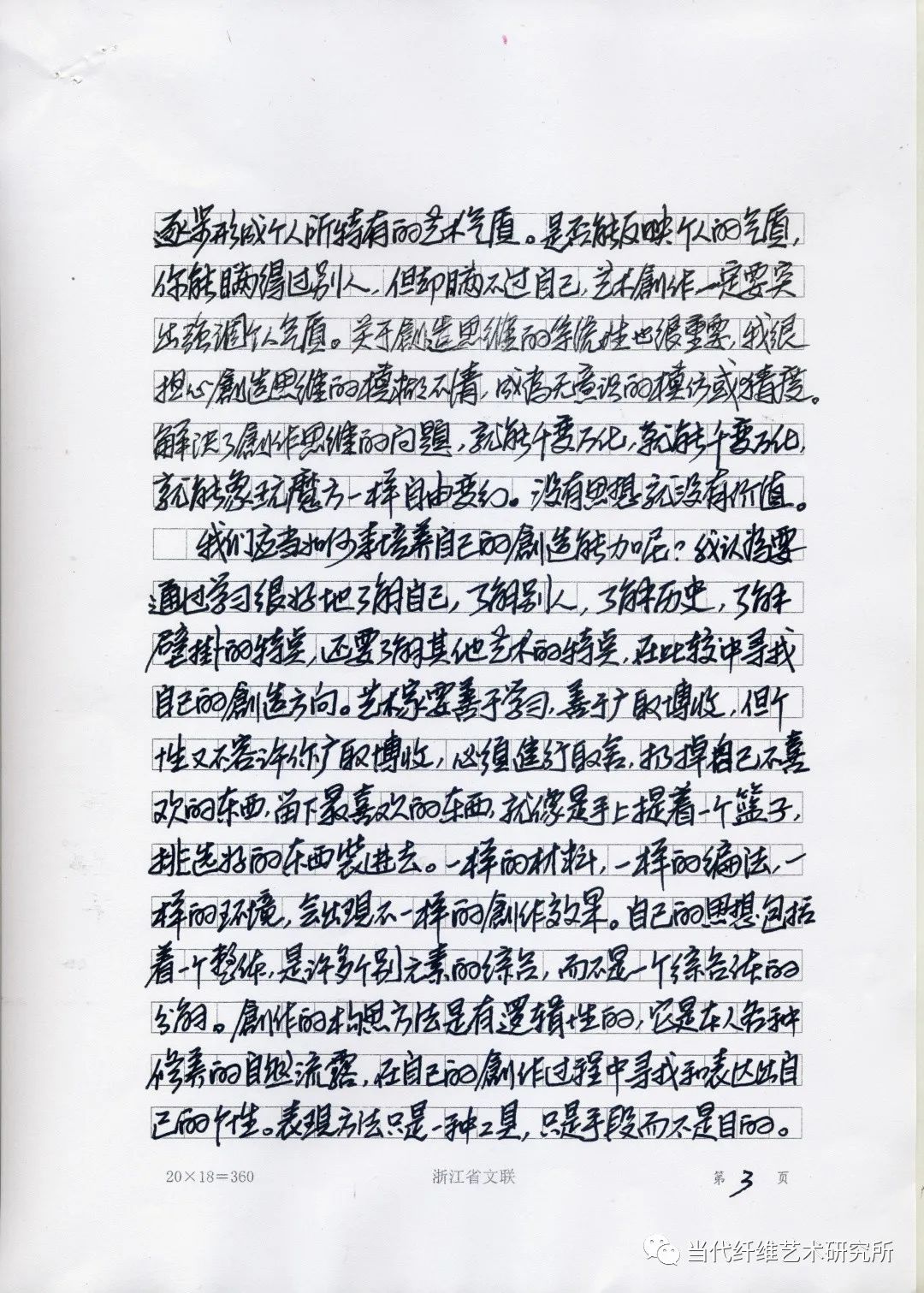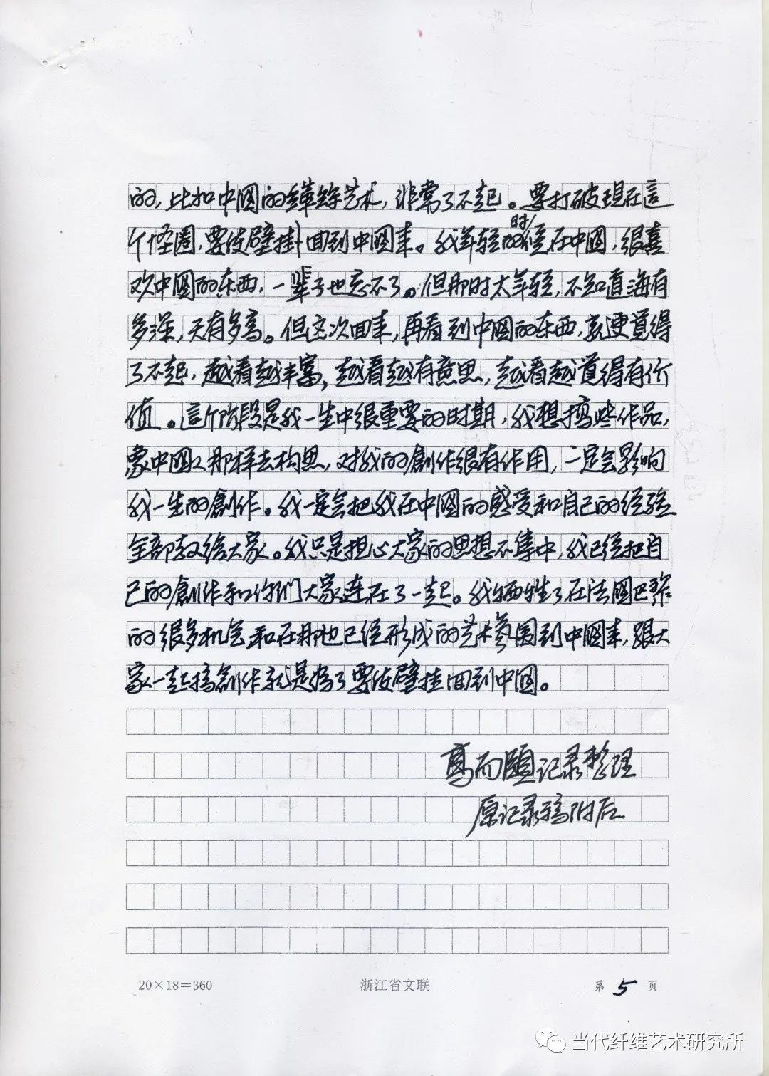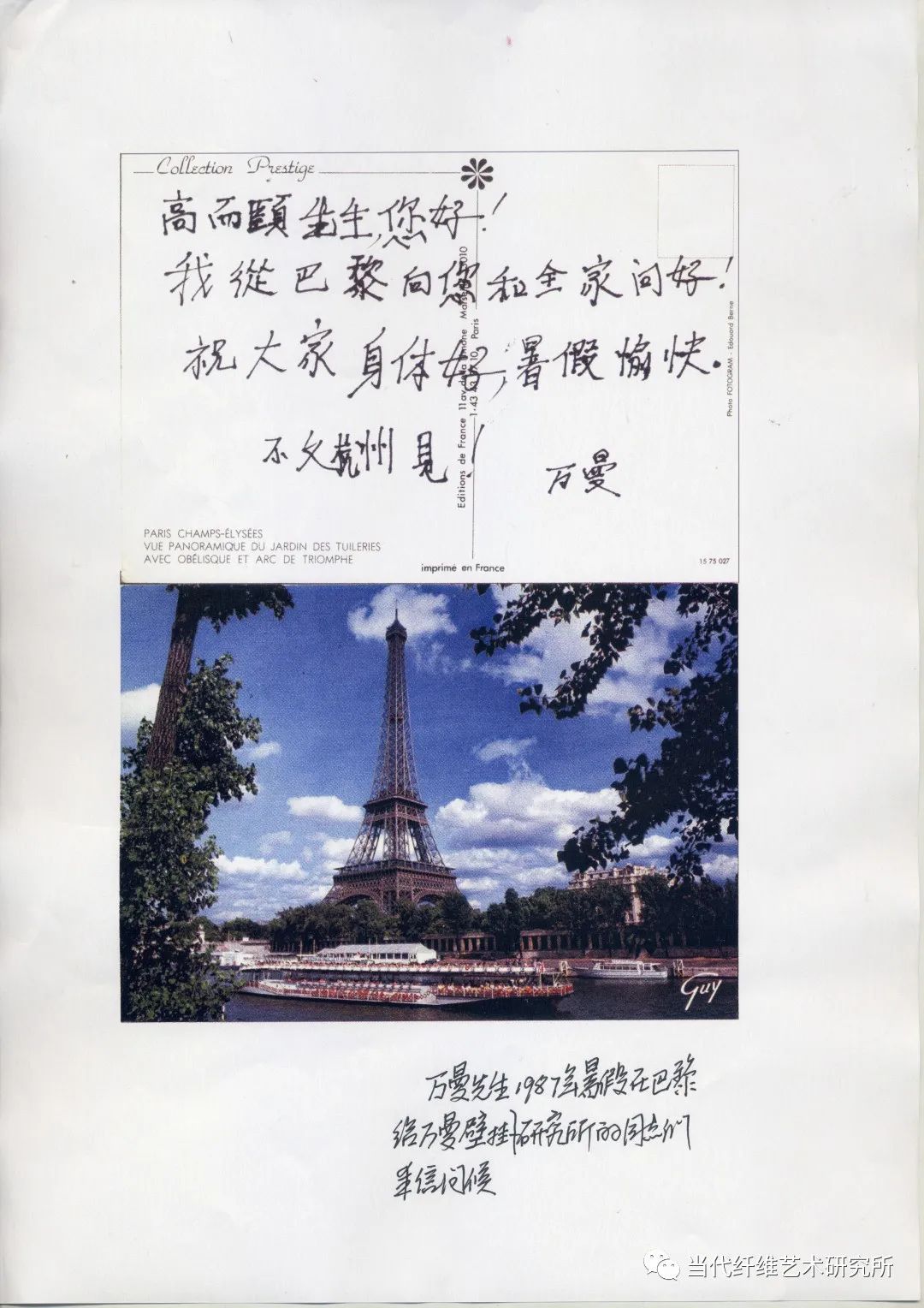 1987年秋,万曼壁挂研究所的作品在参加洛桑国际双年展获奖后,又成功地在上海举办了中国壁挂艺术展,陈列在杭州香格里拉,反映的作品销售形势也很好。万曼先生在一年多紧张的工作后,恰又稍得空闲,晚上常一个独坐在房内看书、做笔记、构草图。我与蔡亮先生商量抽个晚上去陪这个“老头”,听他对今后的打算,顺便还特地求他对销售收入分配的意见。我让夫人炒了四盆菜,加上万曼先生自备的花生来,饼干和绍兴汪厂长送来的一坛的加饭酒(万曼先生管它叫中国的XO),大家兴奋地一直聊到了深夜。我听着听着,忽道得万曼先生这是来中国后最系统的一次艺术思想的阐述,应当记录下来,于是便在他的桌子上找了一个旧信封,摘要地记录下他的讲话。现整理如下,并附上原件。