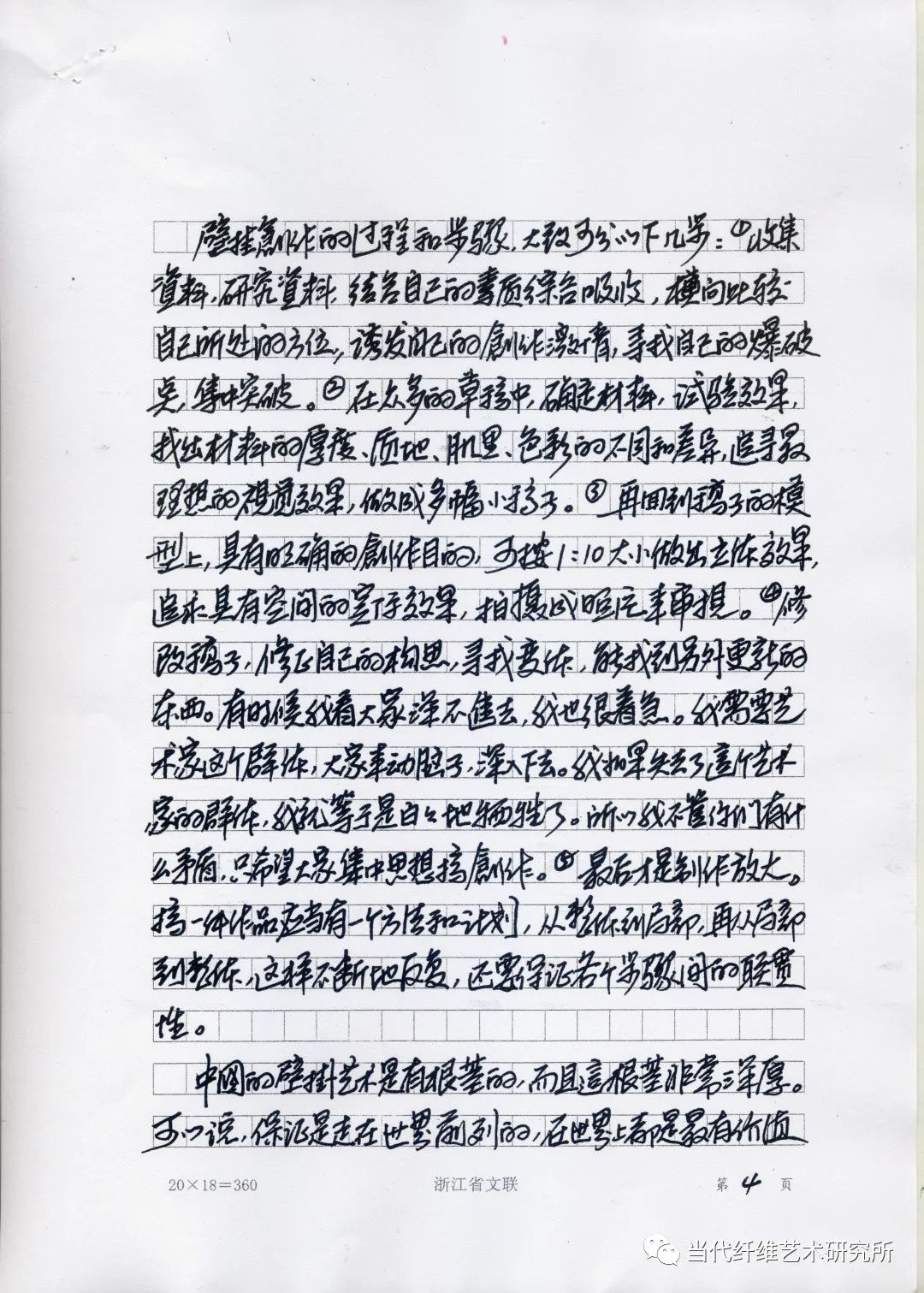 壁挂创作的过程和步骤,大致可以分为以下几步:①收集资料,研究资料,结合自己的素质综合吸收,横向比较自己所处的方位,诱发自己的创作激情,寻找自己的爆破点,集中突破。②在众多的草稿中,确定材料,试验效果,找出材料的厚度、质地、肌理、色彩的不同和差异,追寻最理想的视觉效果,做成多幅小稿子。③再回到稿子的模型上,具有空间的实际效果,拍摄成照片来审视。④修改稿子,修改自己的构思,寻找变化,能找到另外更新的东西。有时候我看大家,深不进去,我也很着急。我需要艺术家这个群体,大家来动脑子,深入下去。我如果失去了这个艺术家的群体,我就等于是白白地牺牲了。所以我不管你们有什么矛盾,只希望大家集中思想搞创作。⑤最后才是制作放大。搞一件作品应当有一个方法和计划,从整体到局部,再从局部到整体,这样不断地反复,还要得证各个步骤间的连贯性。