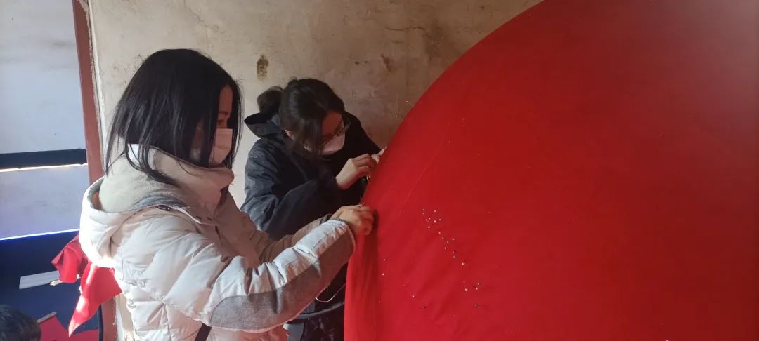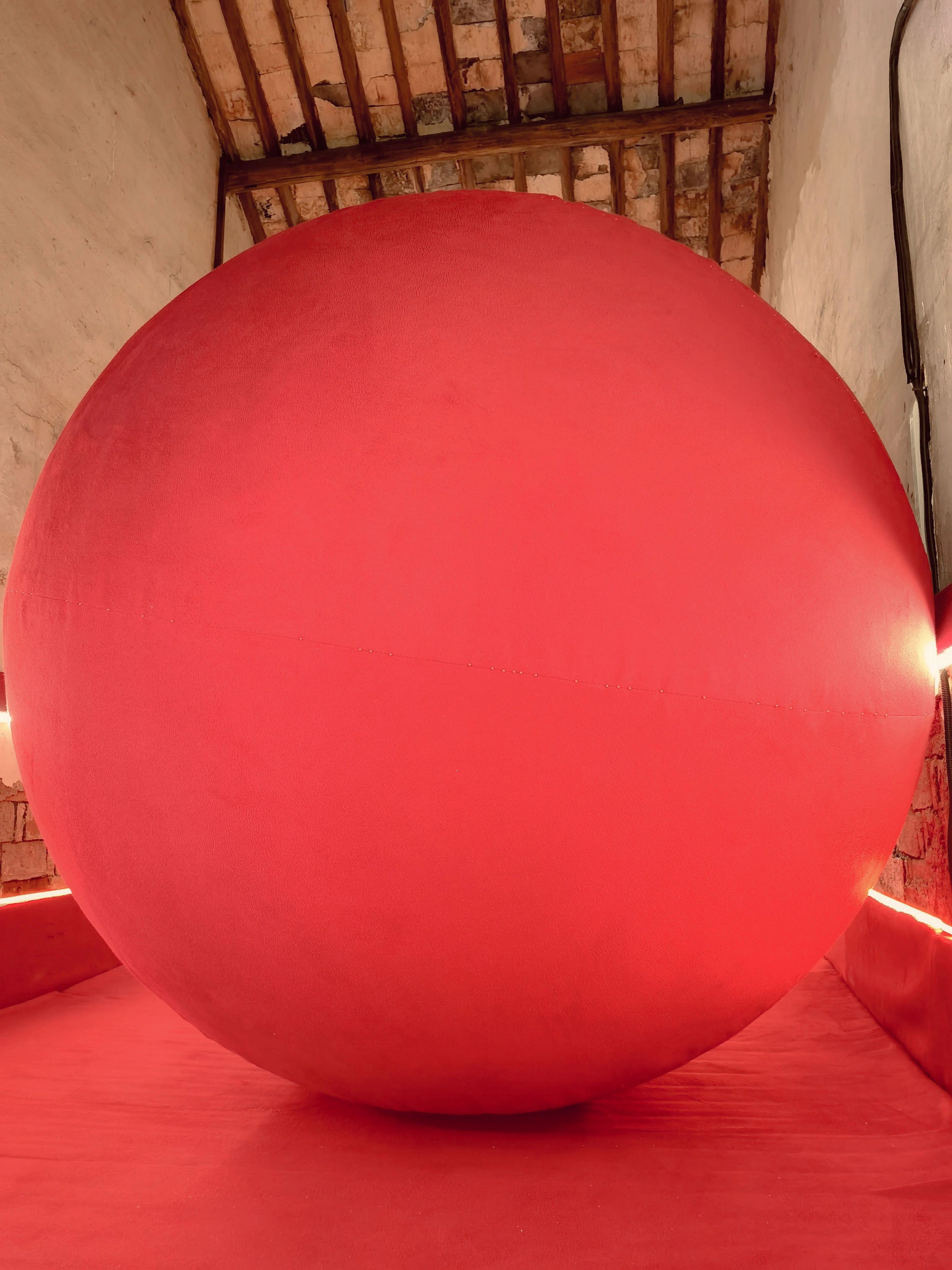 展览概念以软性材料为依托,打造的是一个具有可触性、交互性、呈空间几何形的“柔软博物馆”。充斥老宅入口空间的红色巨型球体,观众可以触摸、挤压和拥抱,过程中需要将这个庞大的物体滚动才得以行走。球体表面的羊绒材质与触碰者产生摩擦,温度在一次次沟通和互动中传递。