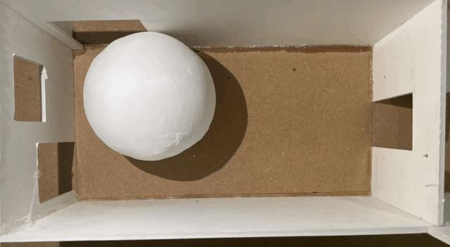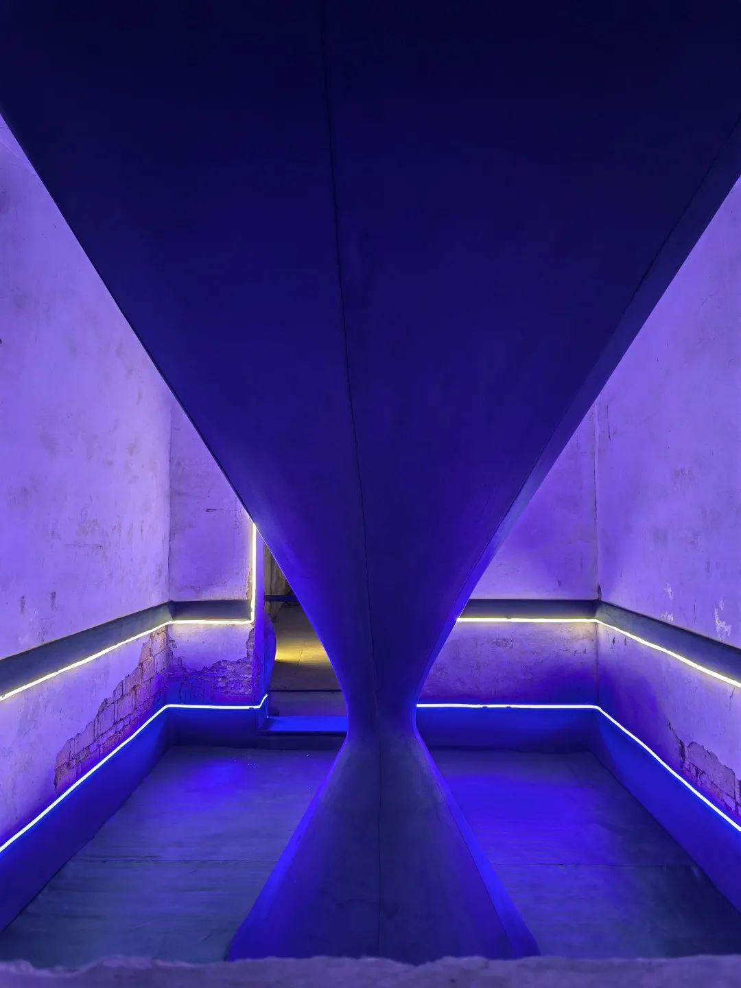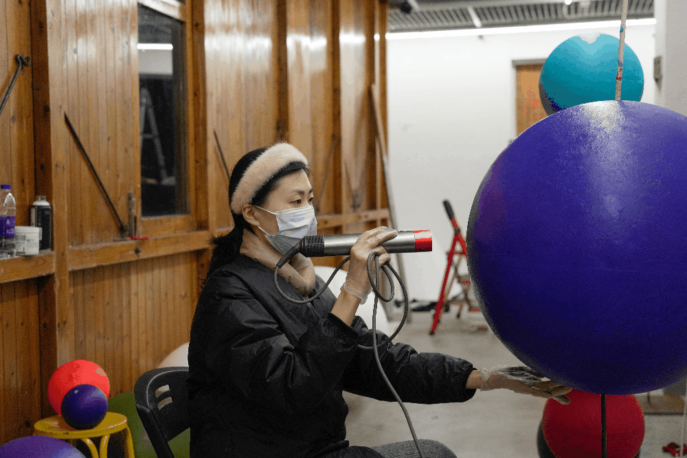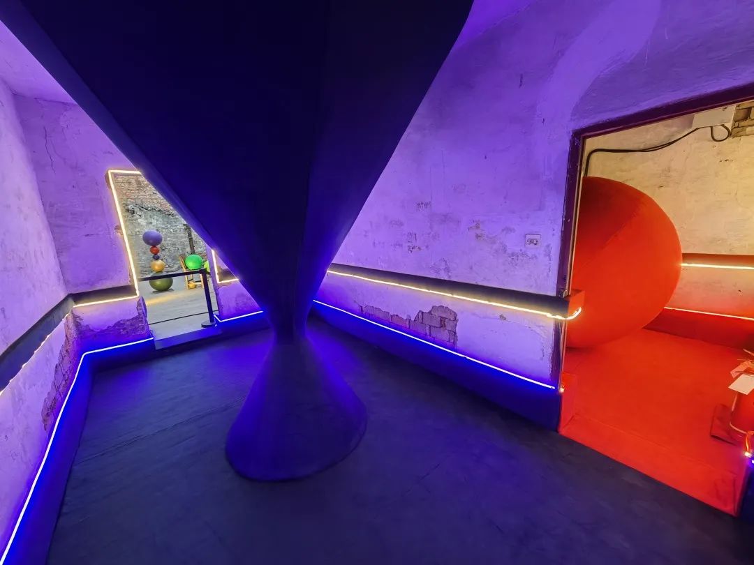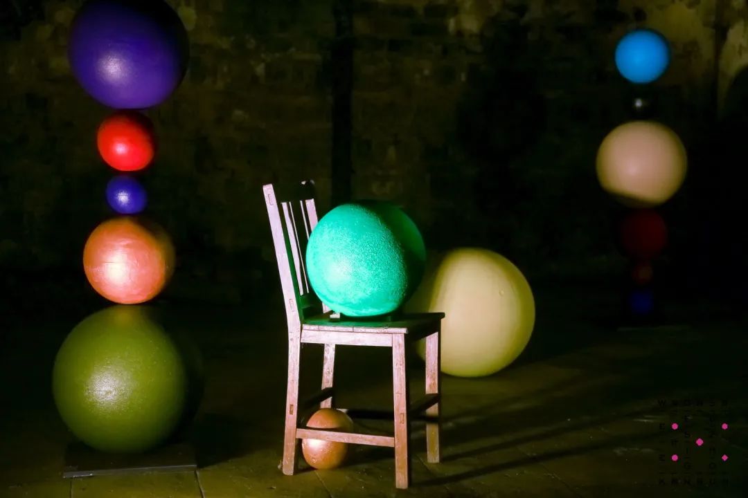 院落内,球体组合以色彩和阳光(灯光)下的律动形态复苏了这间老宅的视觉温度。风动时,落叶飞舞,球在院里旋转,人在屋内游观。