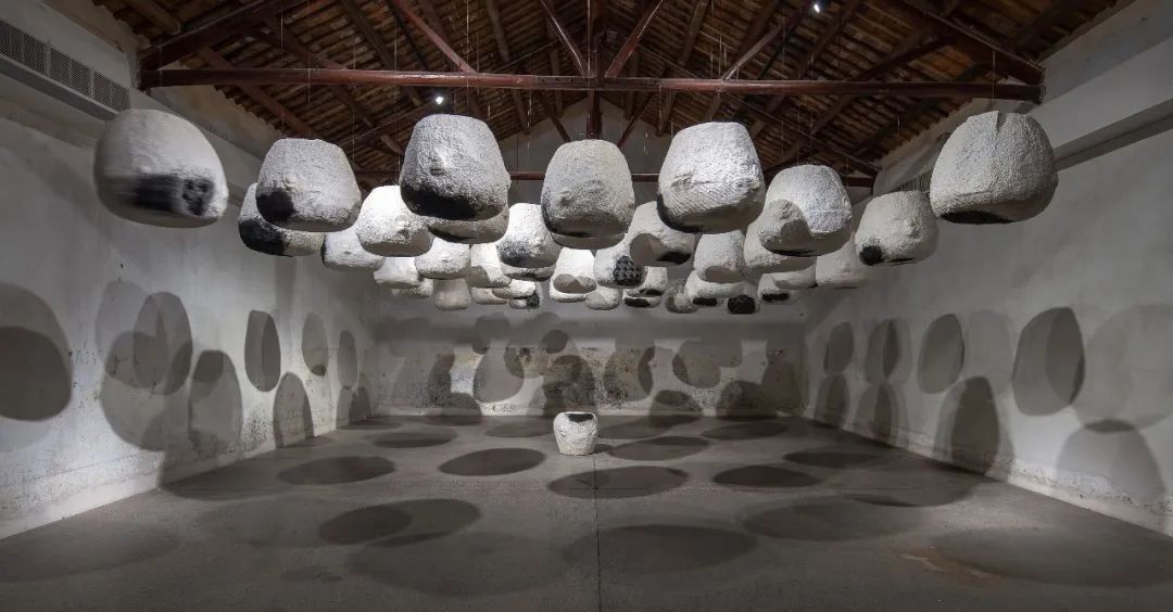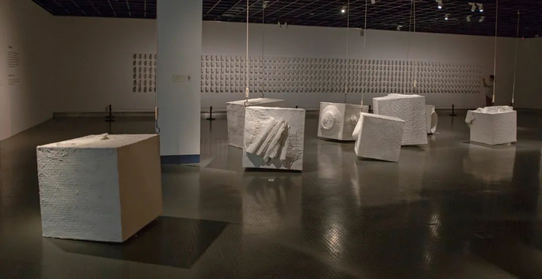 《悬础》Suspending Foundation Stone, 2009-2010, (50x60x60cm)x40,综合材料,纸浆,Multiple Materials, Paper Pulp, 2019年参加 “时间开始了” / 乌镇当代艺术邀请展 2019, March, “Now Is The Time”, Wuzheng Contemporary Art Exhibition