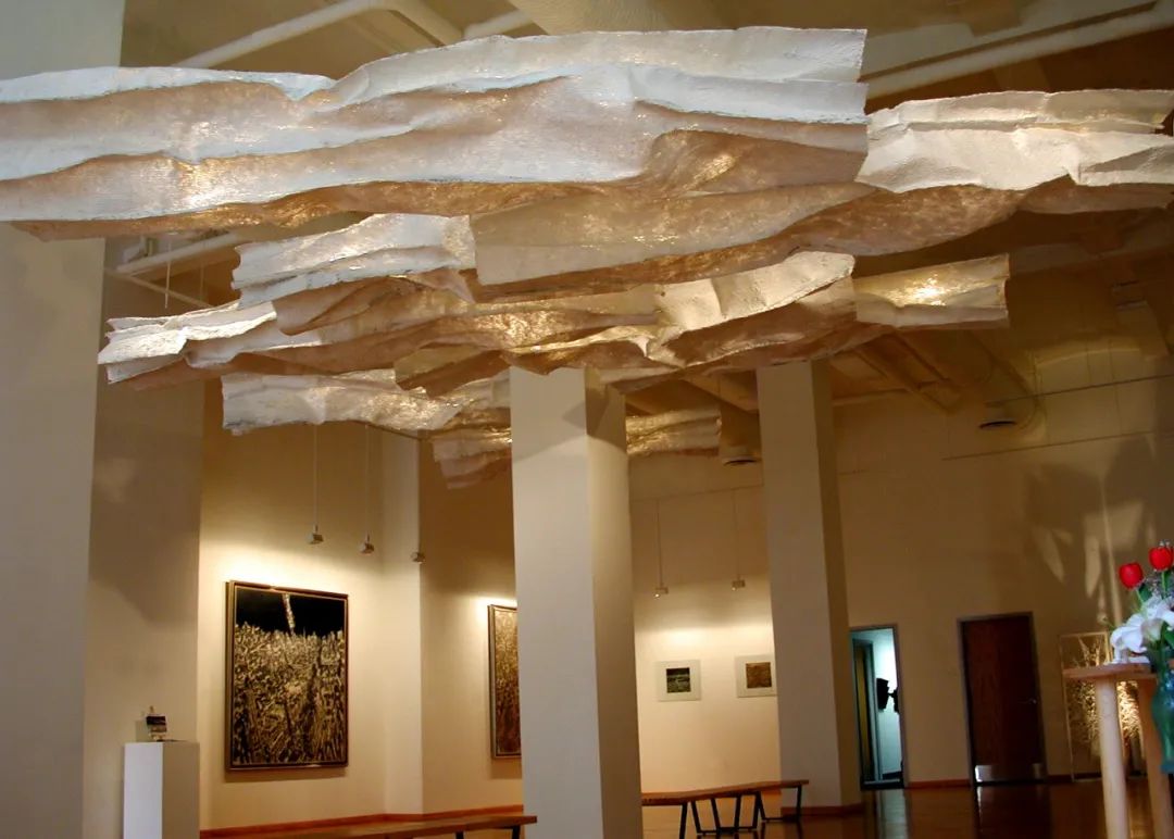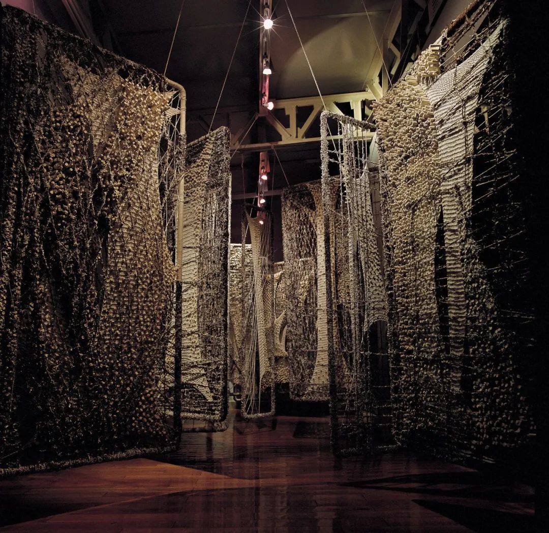 《飘》,Float, 2000, 120x800x400cm,镀锌铁丝网,纸浆,Wire Mesh, Paper Pulp,2001年美国芝加哥哥伦比亚学院画廊展出现场 2001,Columbia College Chicago Gallery, The U.S.