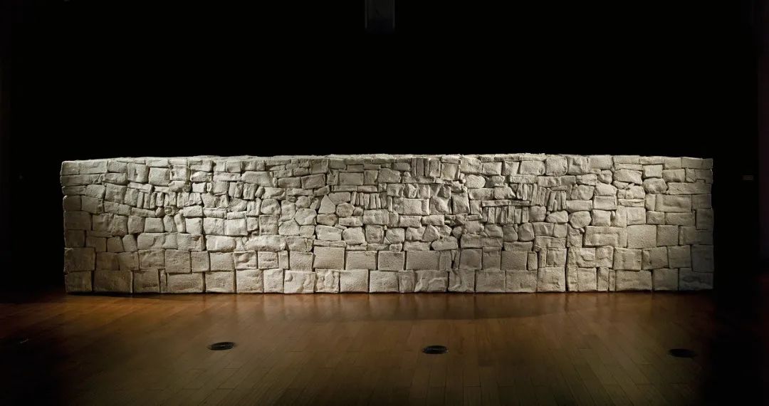 《老墙》Old Wall, 2003-04, 170×800×105cm,镀锌铁网、纸浆,Wire Mesh, Paper Pulp 2003年参加“地之缘-双重时间”亚洲当代艺术邀请展/杭州·中国美术学院美术馆 2003, Parallel Time-Asian Contemporary Art Exhibition/ China Academy of Art, Hangzhou