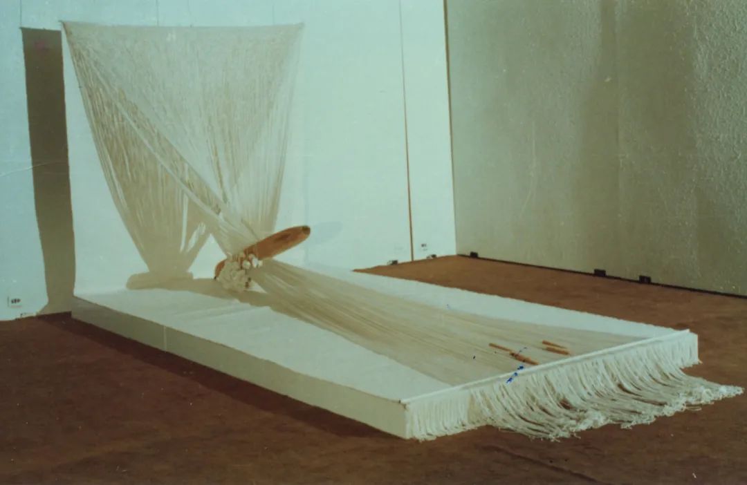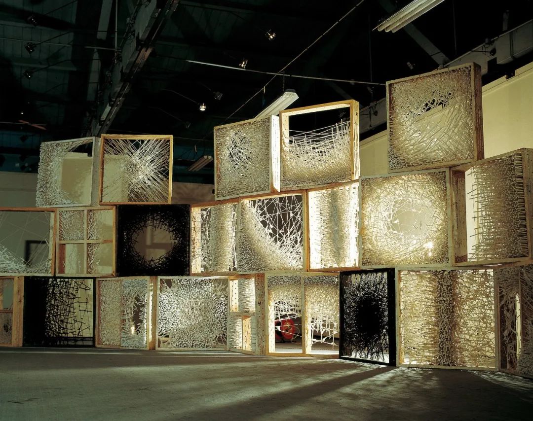 《梭》Shuttle (Suo) 1988,200×200×400cm,棉线、木,1989年参加中国新艺术展/美国 芝加哥 Cotton, Wood, 1989 New Chinese Art Exhibition/ Chicago, the U.S.