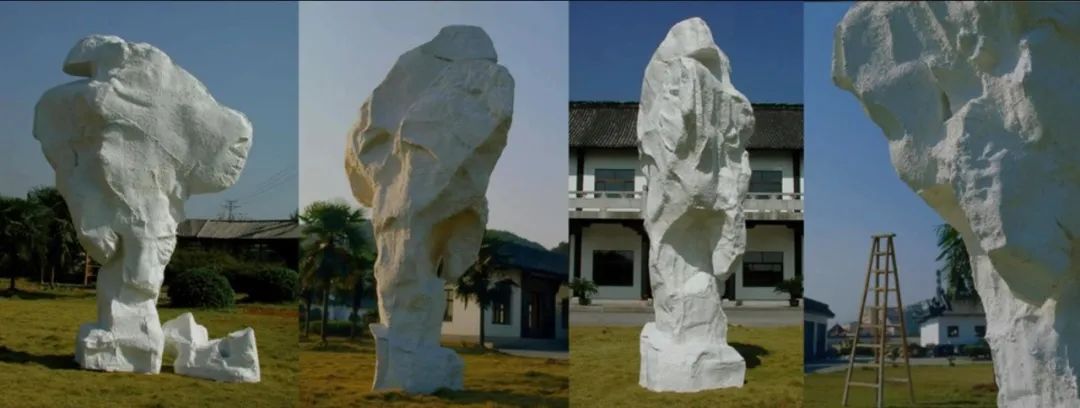 《假的山——一个不同的 文化情景中的视觉思考》Rockery-a Visual Thought in a different Cultural Situation, 2001, 512×240×188cm, 250×145×105cm, 220×140×86cm,镀锌铁网、纸浆、防水剂 Wire Mesh,Paper Pulp,Water Repellant,2001年9月参加 “生活 在此时 —— 29位中国 当代艺术家”展/德国· 柏林国家美术馆 2001, September, Living in Time: 29 Contemporary Artists from China/ National Galerie im hamburger Bahnhof Musuem fur Gegenwart, Berlin, German
