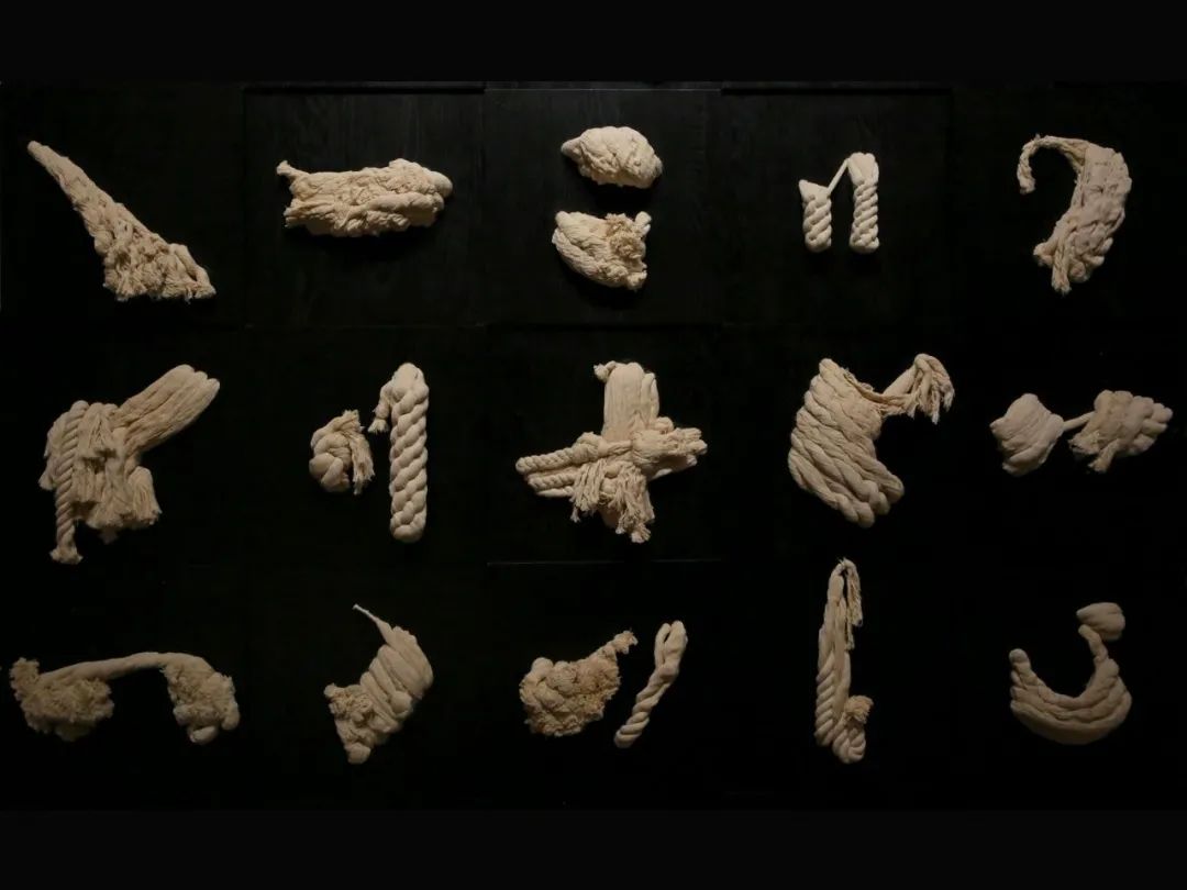 《结之一》 Structure 1, 1994-95, (90×90×15cm)×22 棉线、宣纸、纸浆,Cotton, Xuan Paper, Paper Pulp,1995年参加中国新艺术展/德国·汉堡现代艺术中心 1995 New Art From China at Haus der Kulturen der Welt, German
